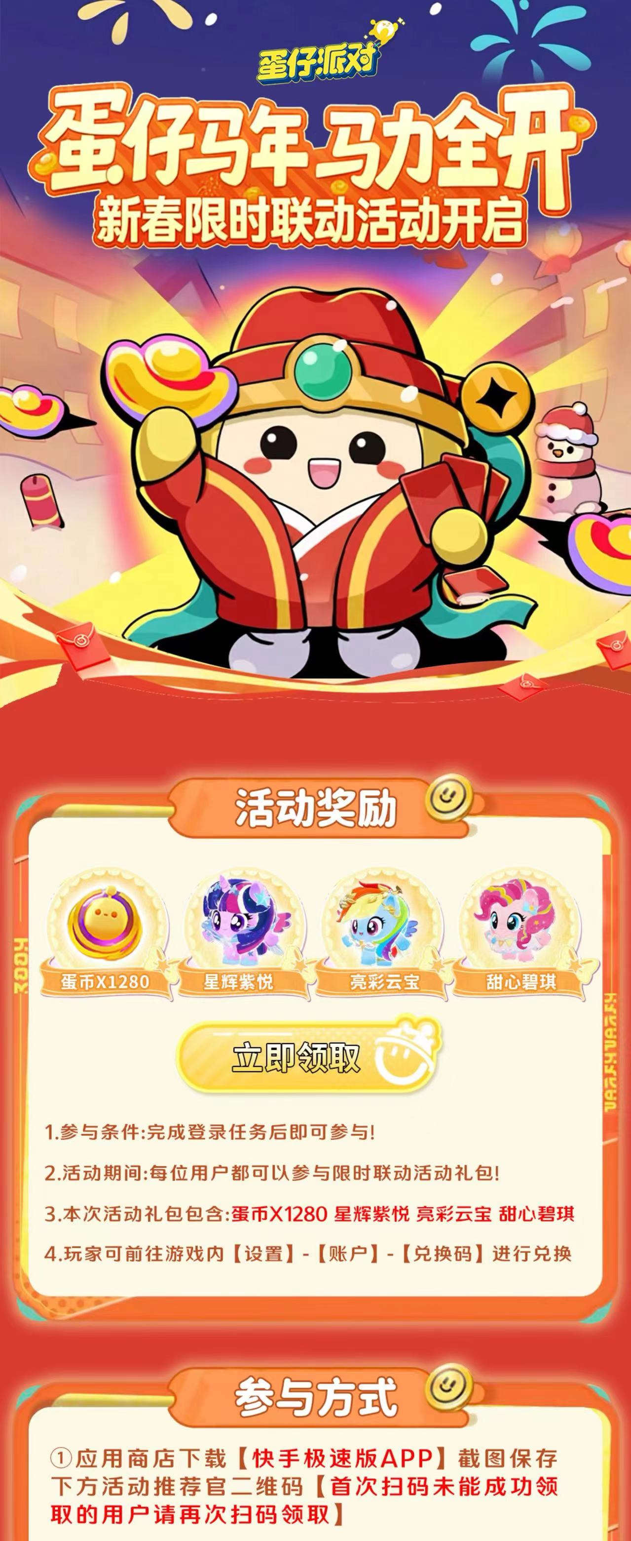 礼包内含:【兑换码 FYHUBJOPTYX 蛋币X1280 星辉紫悦 亮彩云宝 甜心碧琪 】